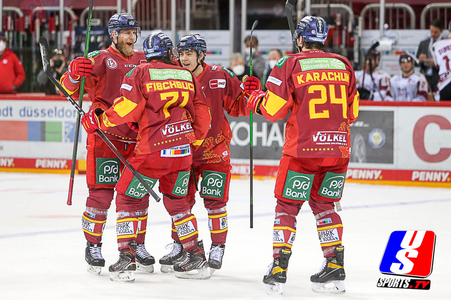 Schon im ersten Drittel dominierten die Gastgeber im ISS Dome die Begegnung. Tobias Eder läutete den Torreigen der Düsseldorfer an diesem Abend in der 7. Minute ein. In Überzahl setzte Nicholas Jensen noch vor der Pause nach.