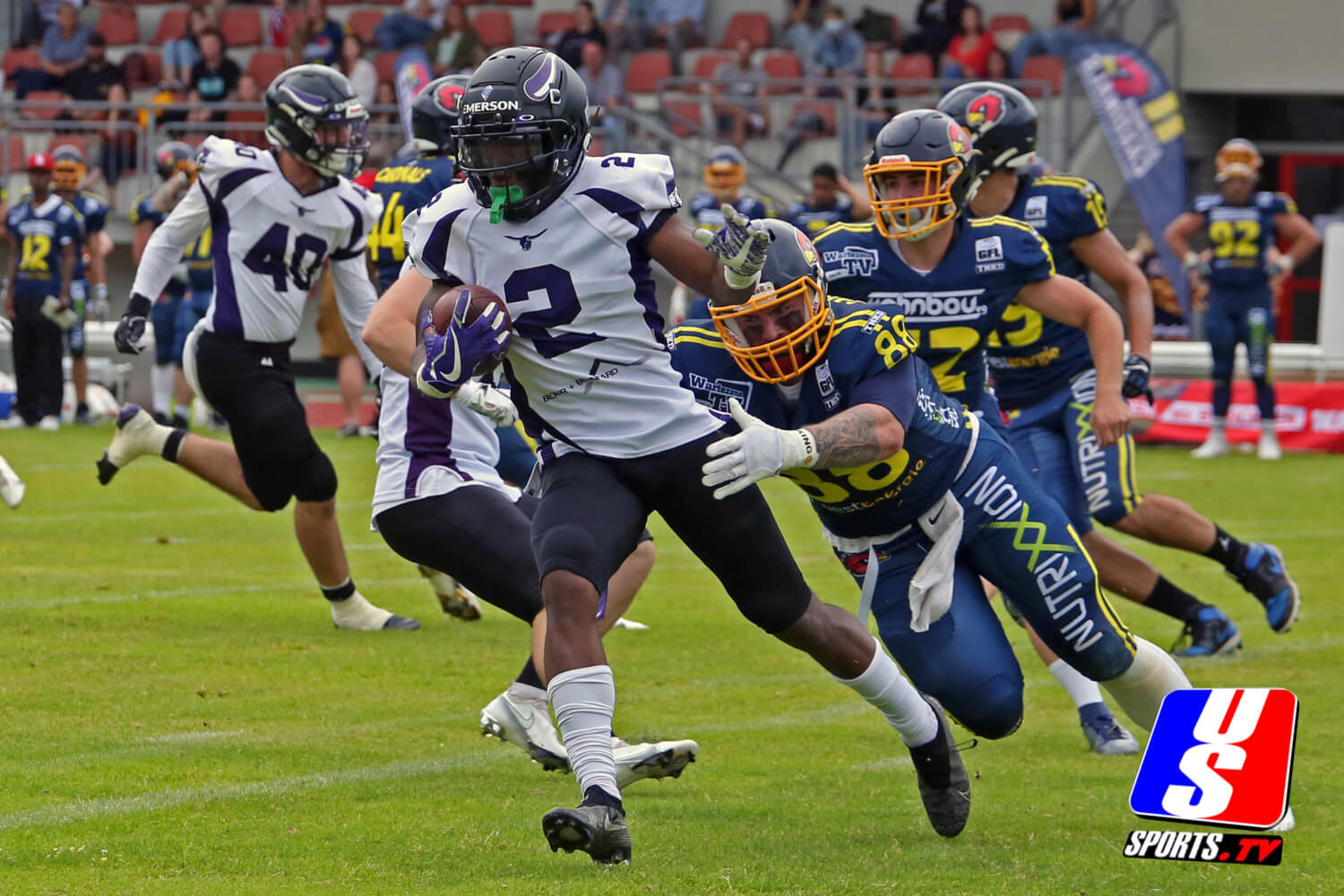 Langenfeld Longhorns Widereceiver Nr 2 Jarvis McCalm entkommt dem Tackle